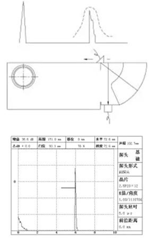 根據(jù)AVG原理,在探頭探傷時(shí)可把R100mm圓弧面視為大平底反射,以此來調(diào)整探測靈敏度。直探頭探傷時(shí)可把厚度為25/100mm的幾個(gè)側(cè)面視為大平底處理,以此來調(diào)整靈敏度。另外,也可以根據(jù)探傷要求,儀測量1.5mm橫通孔反射波來確定靈敏度。